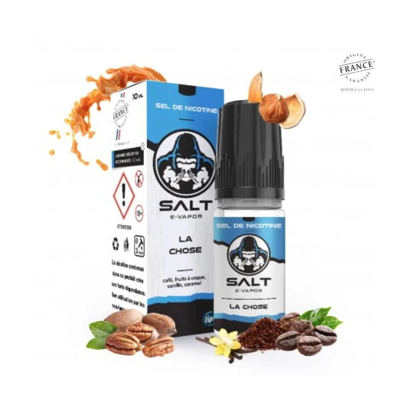 Découvrez (ou redécouvrez) l’excellence gourmande du French Liquide dans une version avec sel de nicotine. La Chose, c’est presque une institution, avec sa combinaison unique d’arômes tous plus parfumés les uns que les autres. Retrouvez alors sa recette secrète de e-liquide à base de caramel beurre salé, de vanille, de café, de noisette et pour finir, de noix de pécan.